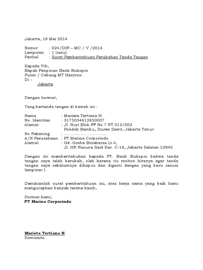 Contoh Surat Pemberitahuan Perubahan Nomor Rekening Bank Perusahaan Kumpulan Surat Penting
