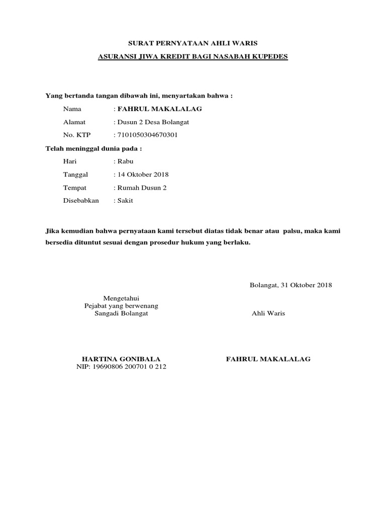 Kematian Contoh Surat Pernyataan Ahli Waris Nusagates